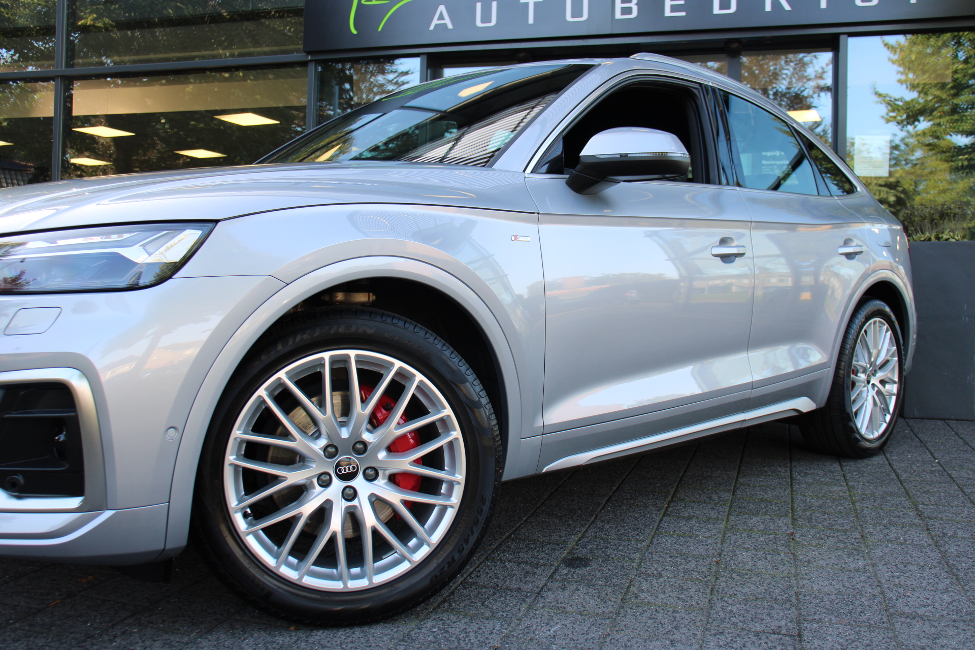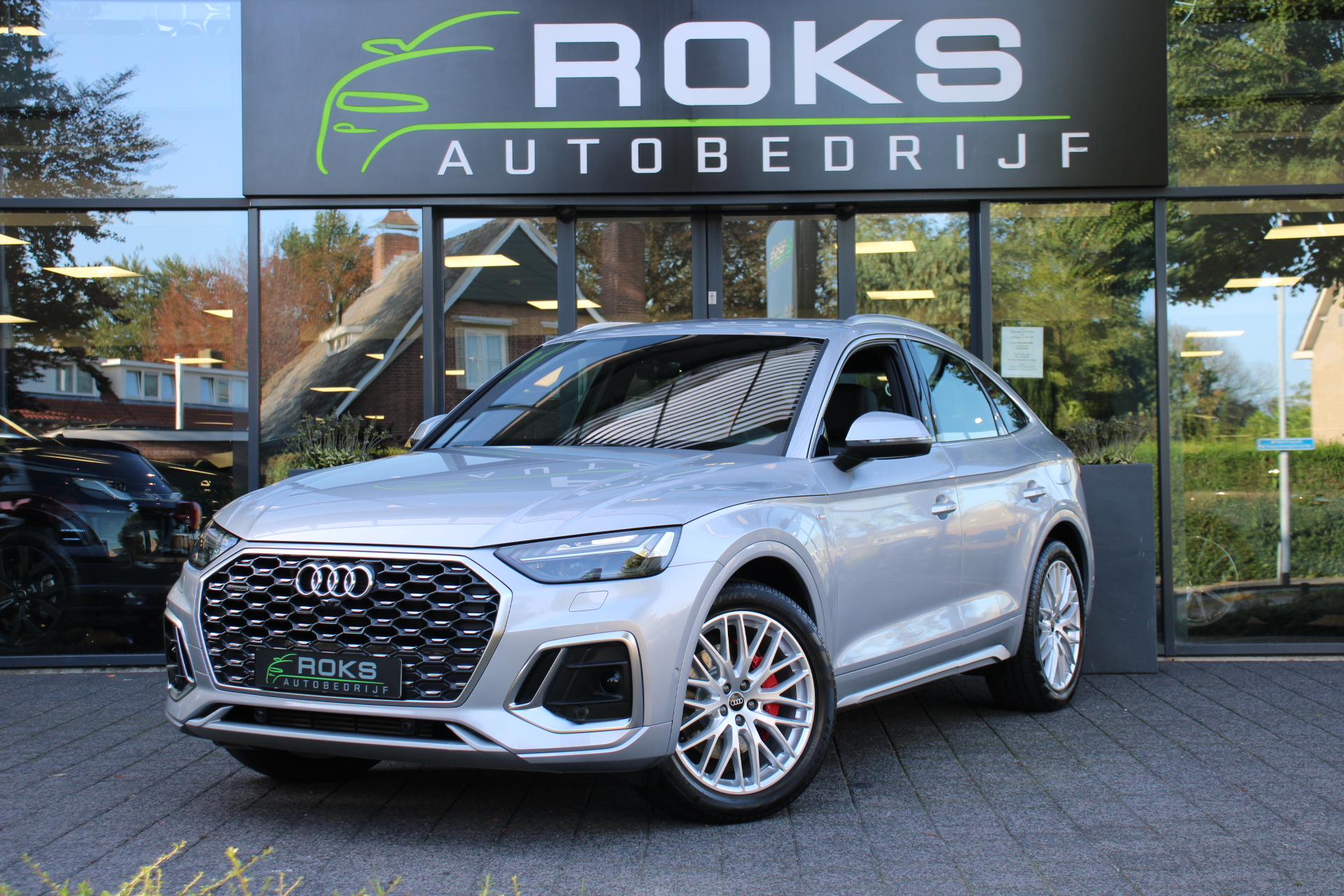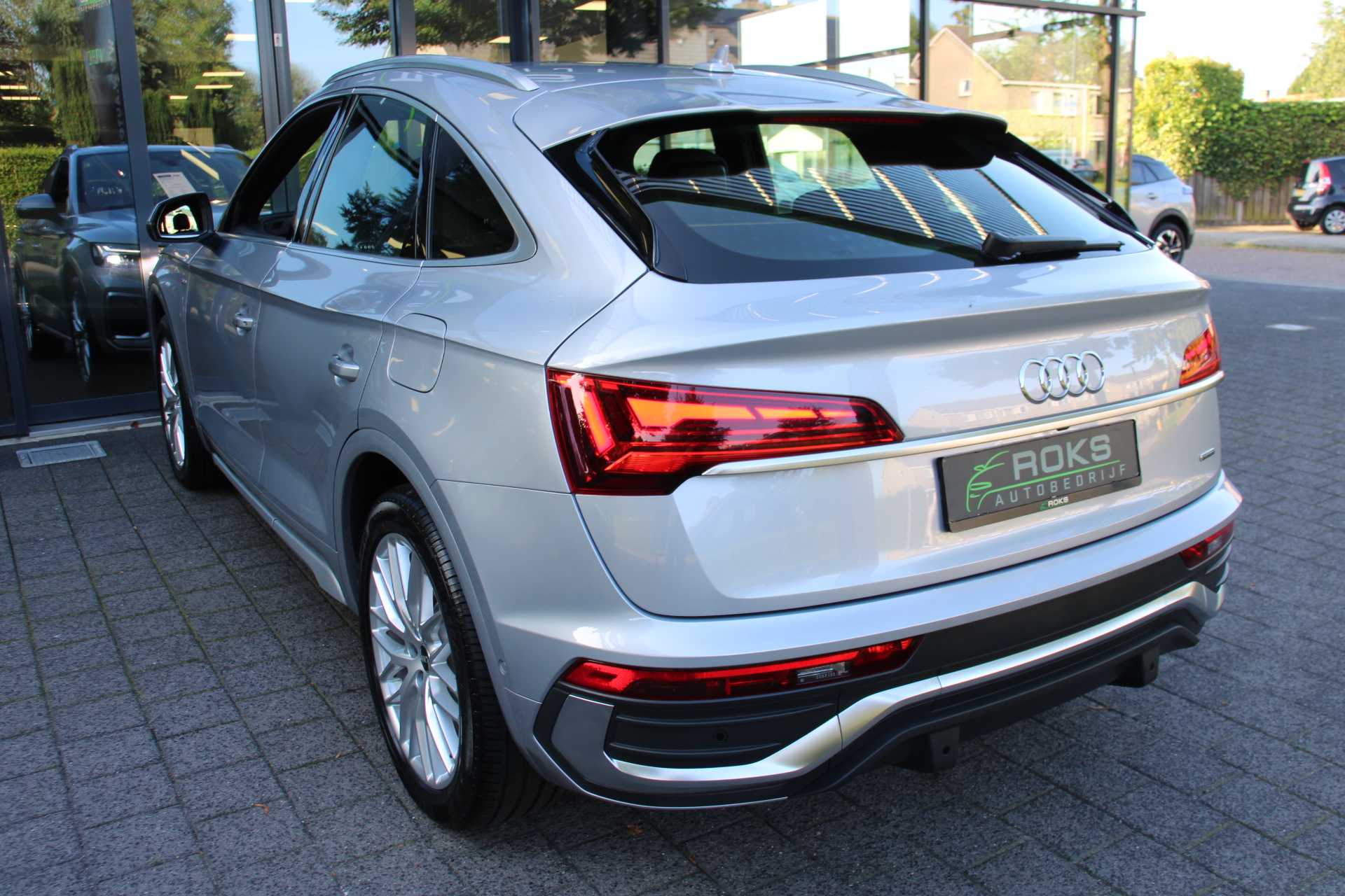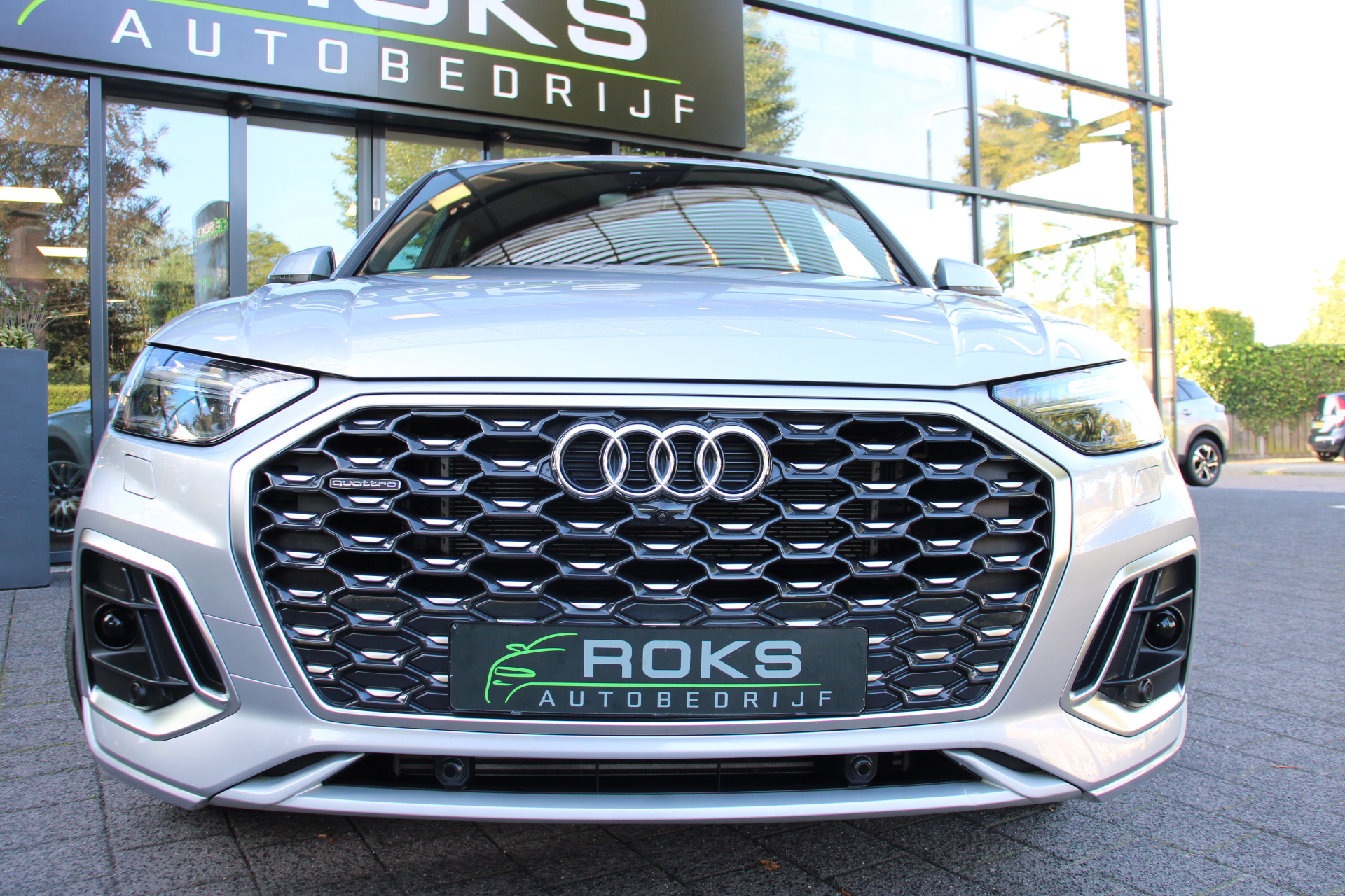Het is een nette en comfortabele auto, deze Audi Q5 Sportback, hij heeft 27395 kilometer gelopen. Met de S line exterieur styling mag deze auto zeker gezien worden. Brandstofmotor, elektromotor? Deze hybride Audi Q5 Sportback combineert ze. En dat is te merken bij de pomp, want die ziet u voortaan minder vaak. Op zelfs de koudste ochtend biedt de stoelverwarming een heerlijk welkom. Dat stabiele weggevoel onder alle condities, da's nou een van de voordelen van luchtvering. Een praktische extra is de elektrisch bedienbare achterklep die opent en sluit met een druk op de knop. Ook achterin heerst een luxe sfeer, vanwege de verwarmde achterbank. De kwaliteit van de matrix LED-verlichting geeft het gevoel dat u bij daglicht rijdt. Tot de voorzieningen van deze auto behoren 20 inch lichtmetalen velgen, halflederen bekleding, warmtewerend glas, zwarte hemelbekleding, aluminium dakrailing en in delen neerklapbare achterbank.