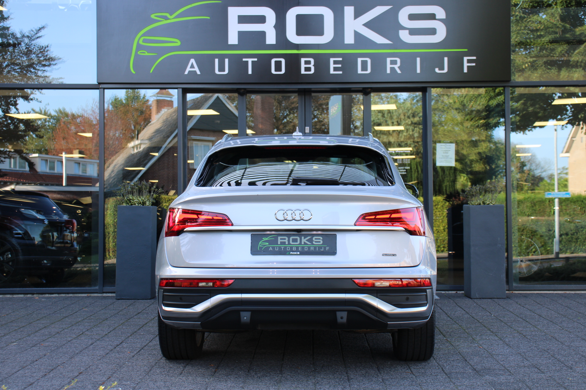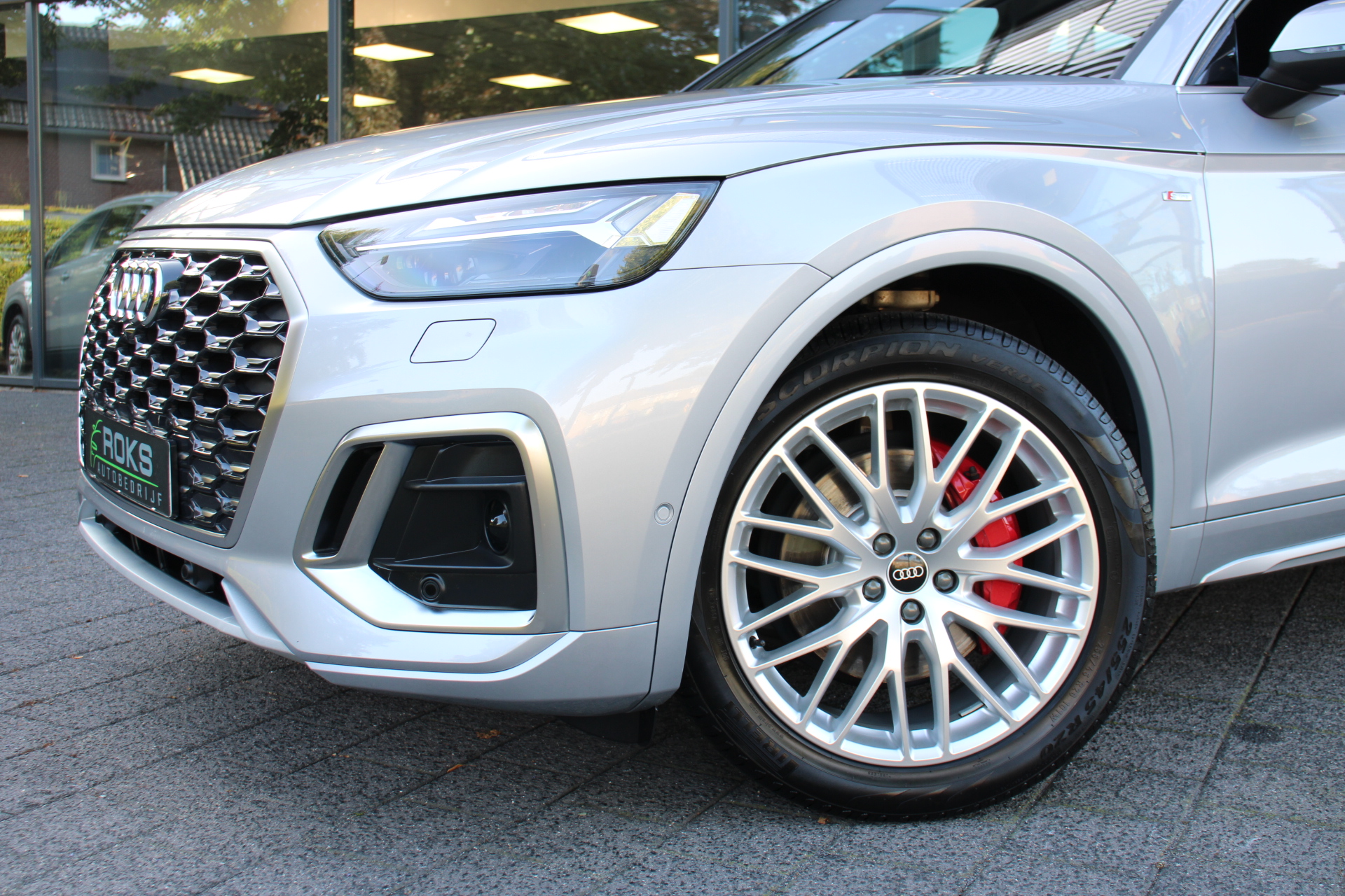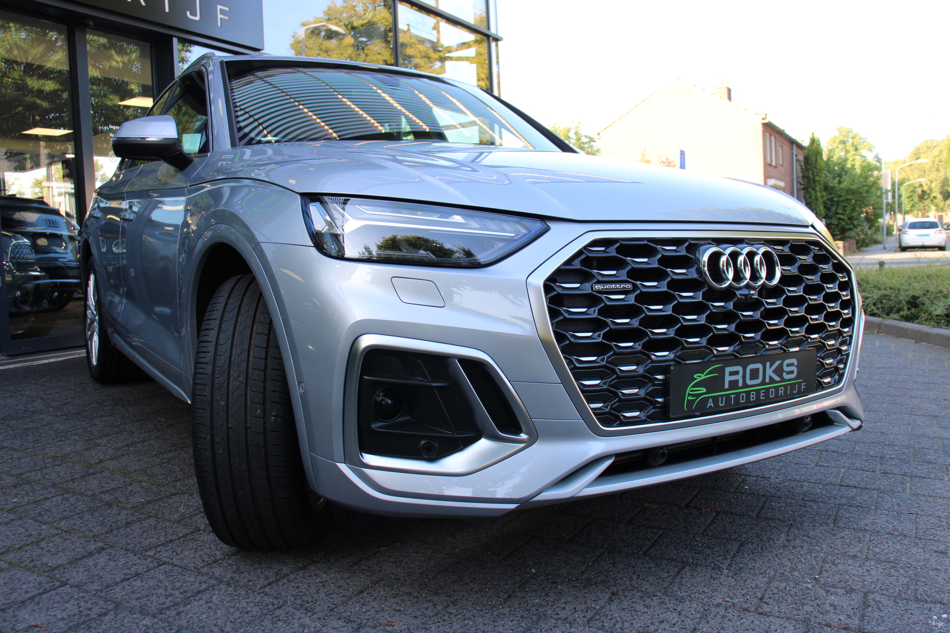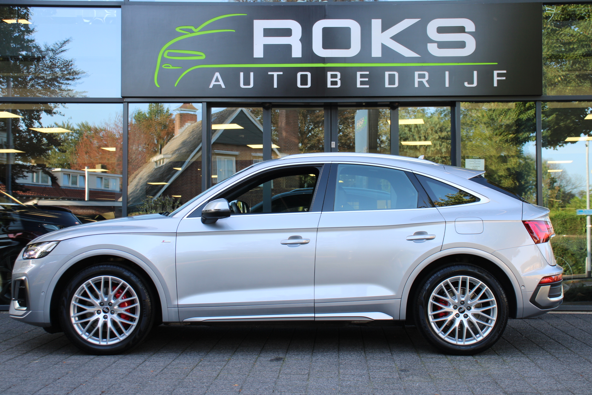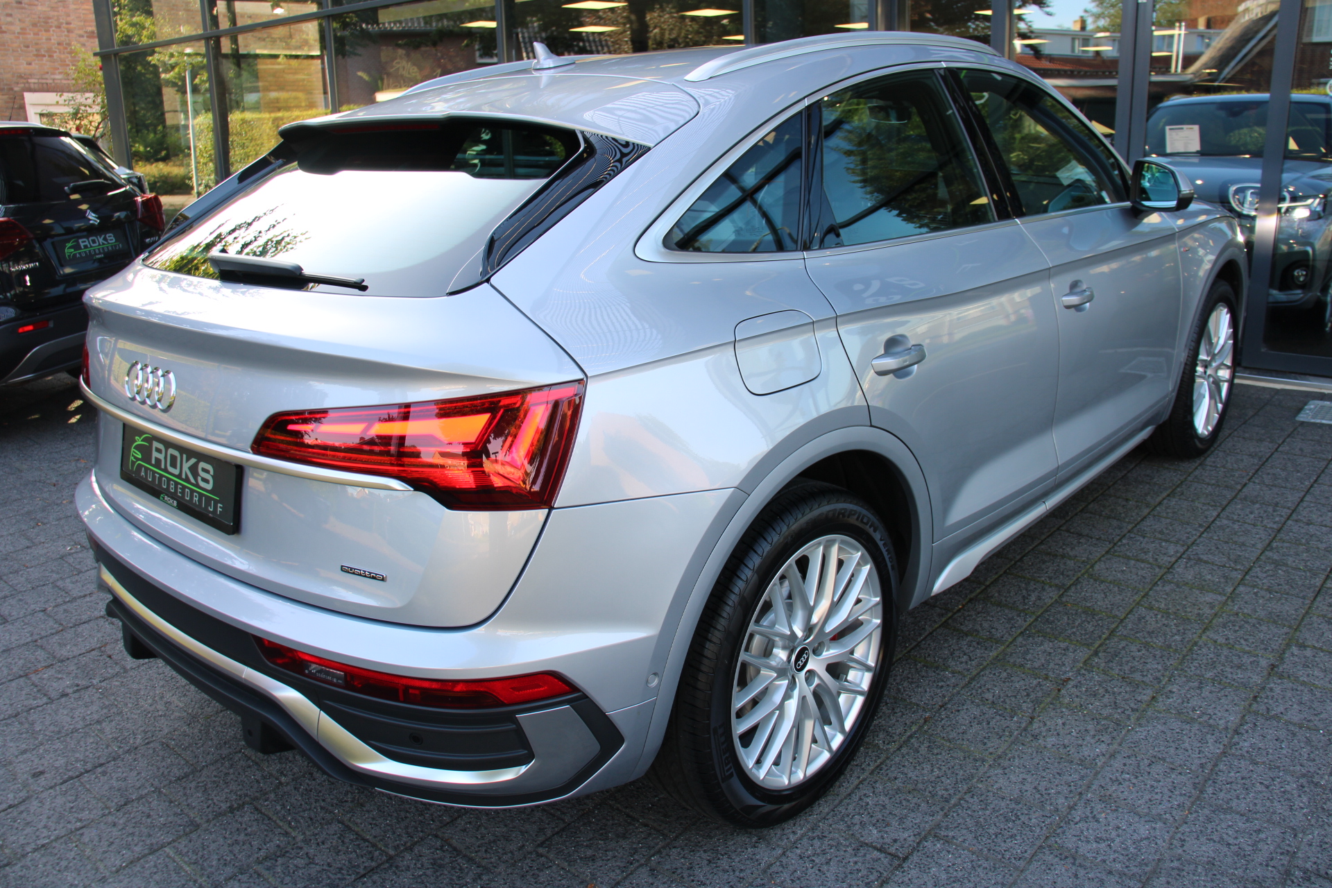 Het is een nette en comfortabele auto, deze Audi Q5 Sportback, hij heeft 27395 kilometer gelopen. Met de S line exterieur styling mag deze auto zeker gezien worden. Brandstofmotor, elektromotor? Deze hybride Audi Q5 Sportback combineert ze. En dat is te merken bij de pomp, want die ziet u voortaan minder vaak. Op zelfs de koudste ochtend biedt de stoelverwarming een heerlijk welkom. Dat stabiele weggevoel onder alle condities, da's nou een van de voordelen van luchtvering. Een praktische extra is de elektrisch bedienbare achterklep die opent en sluit met een druk op de knop. Ook achterin heerst een luxe sfeer, vanwege de verwarmde achterbank. De kwaliteit van de matrix LED-verlichting geeft het gevoel dat u bij daglicht rijdt. Tot de voorzieningen van deze auto behoren 20 inch lichtmetalen velgen, halflederen bekleding, warmtewerend glas, zwarte hemelbekleding, aluminium dakrailing en in delen neerklapbare achterbank.